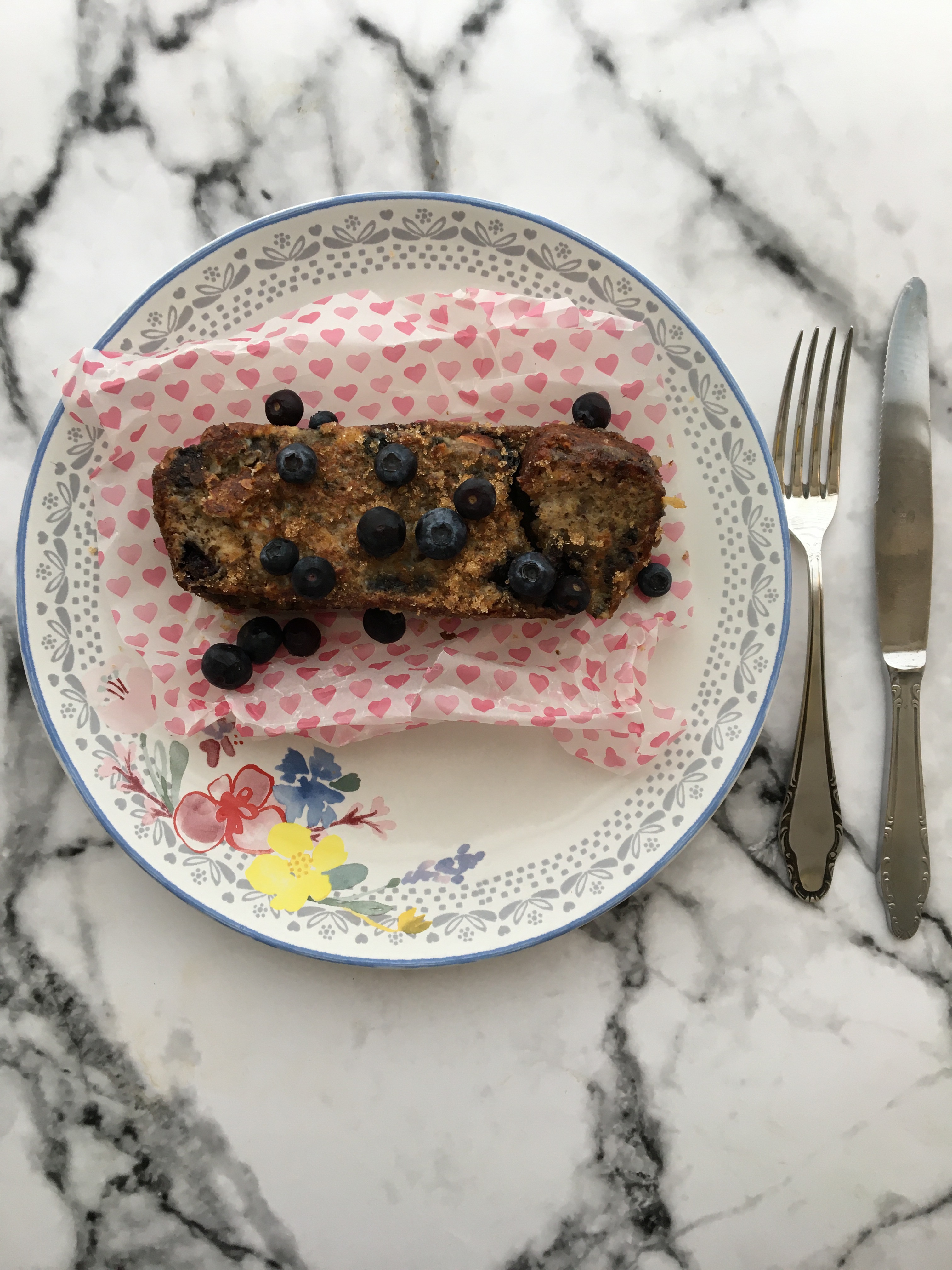 Een poosje geleden maakte ik van leftovers bananenbrood met blauwe bessen.